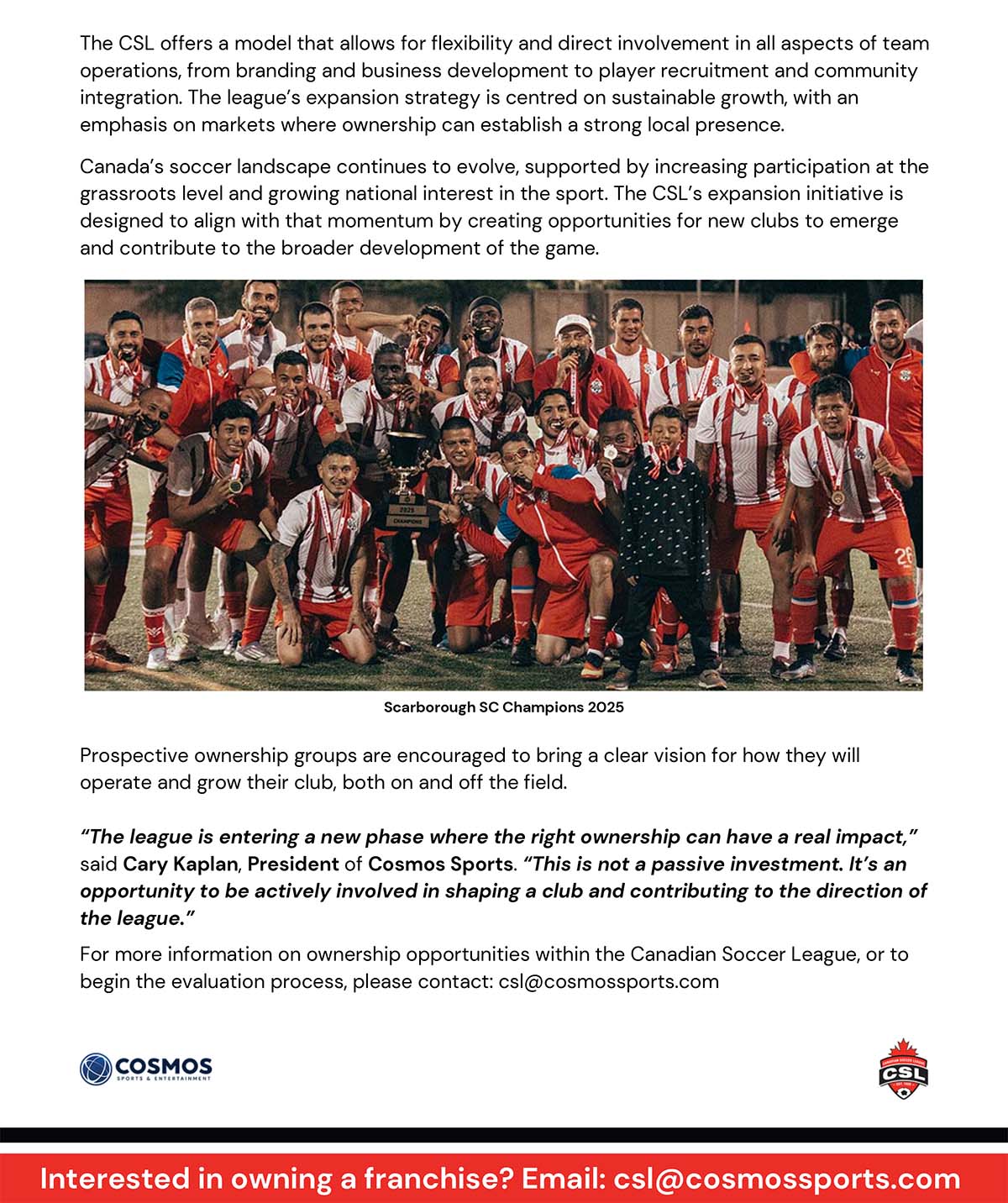 Cosmos Sports and Entertainment is a highly regarded sports marketing company well versed in Canada’s soccer scene with its president, Cary Kaplan the former commissioner of the CSL, a position held following an earlier career as president of Hamilton Bulldogs of the American Hockey League. During his tenure at the AHL Kaplan was elected the executive of the year in 1999.